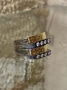 silver ring with 18 k gold, cubic zirconia and hand engraved decoration