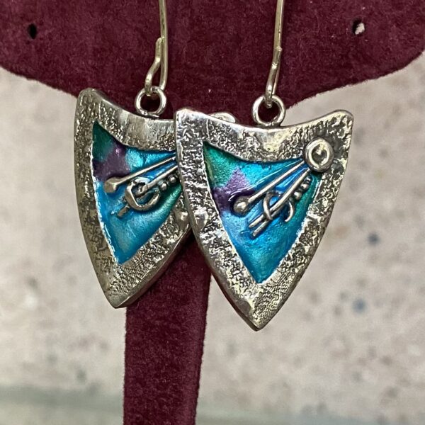 Hanging silver square earrings with enamelled design of a fish and a starfish