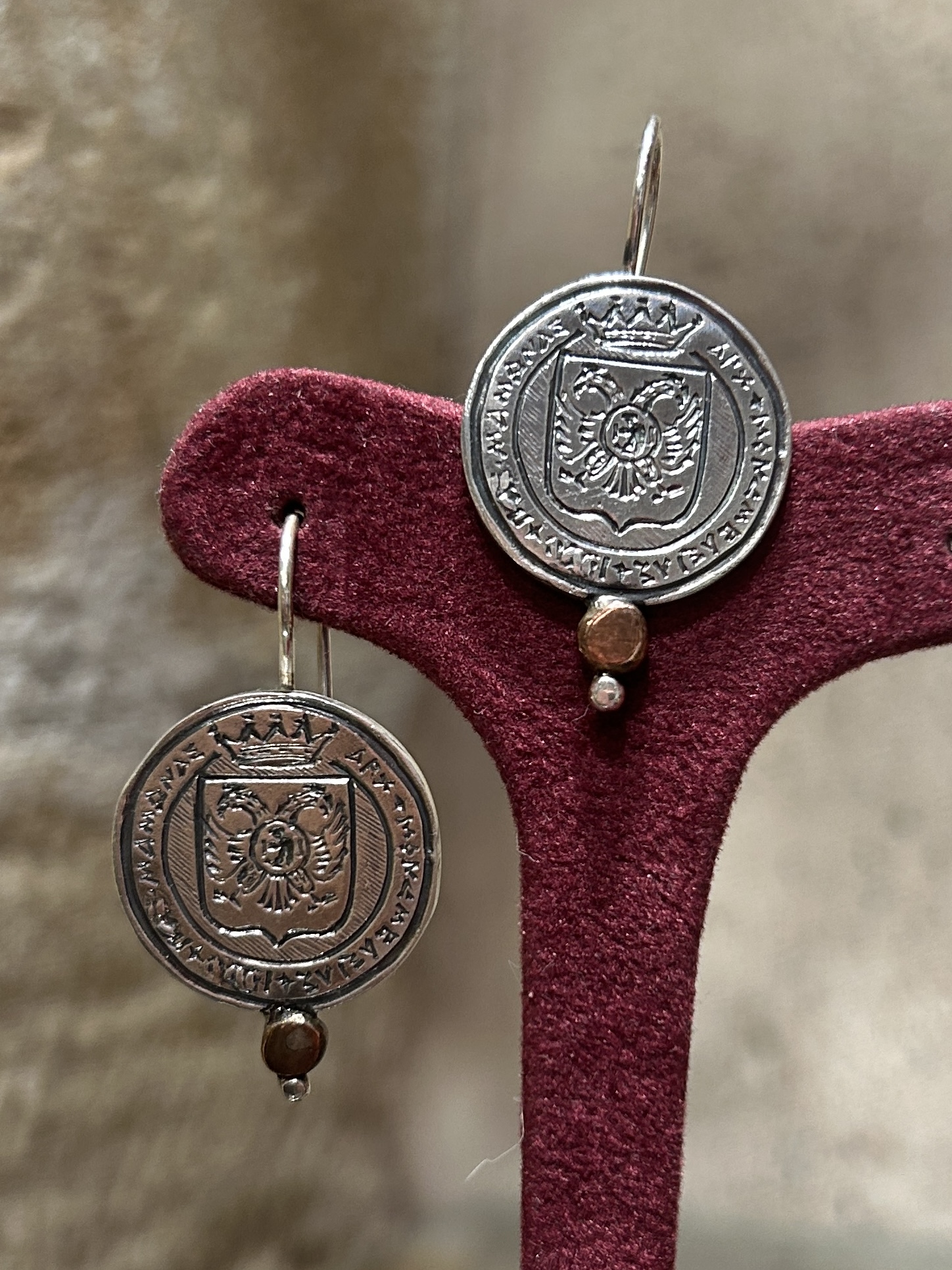 hanging silver earrings inspired by a byzantine family crest of Monemvasia