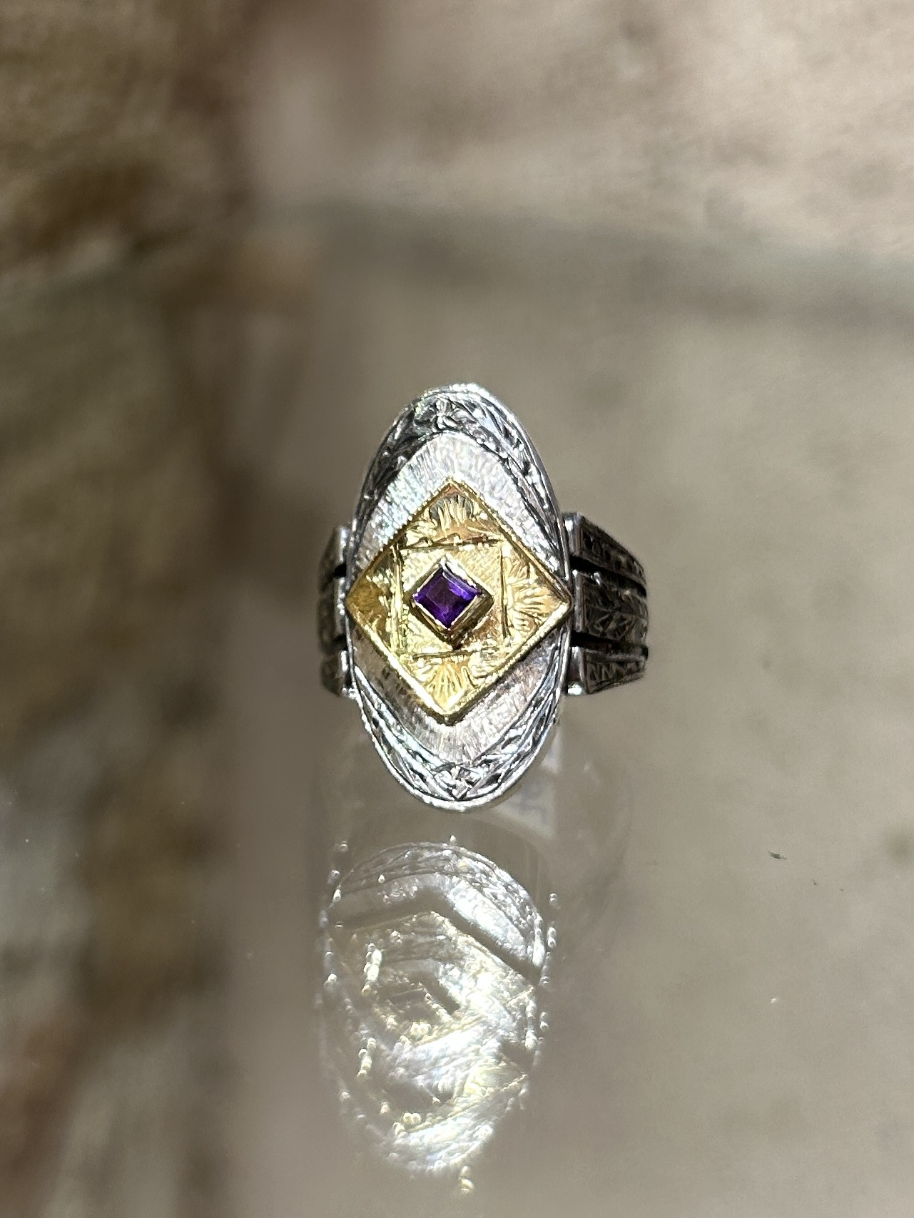 silver and gold ring made and engraved by hand