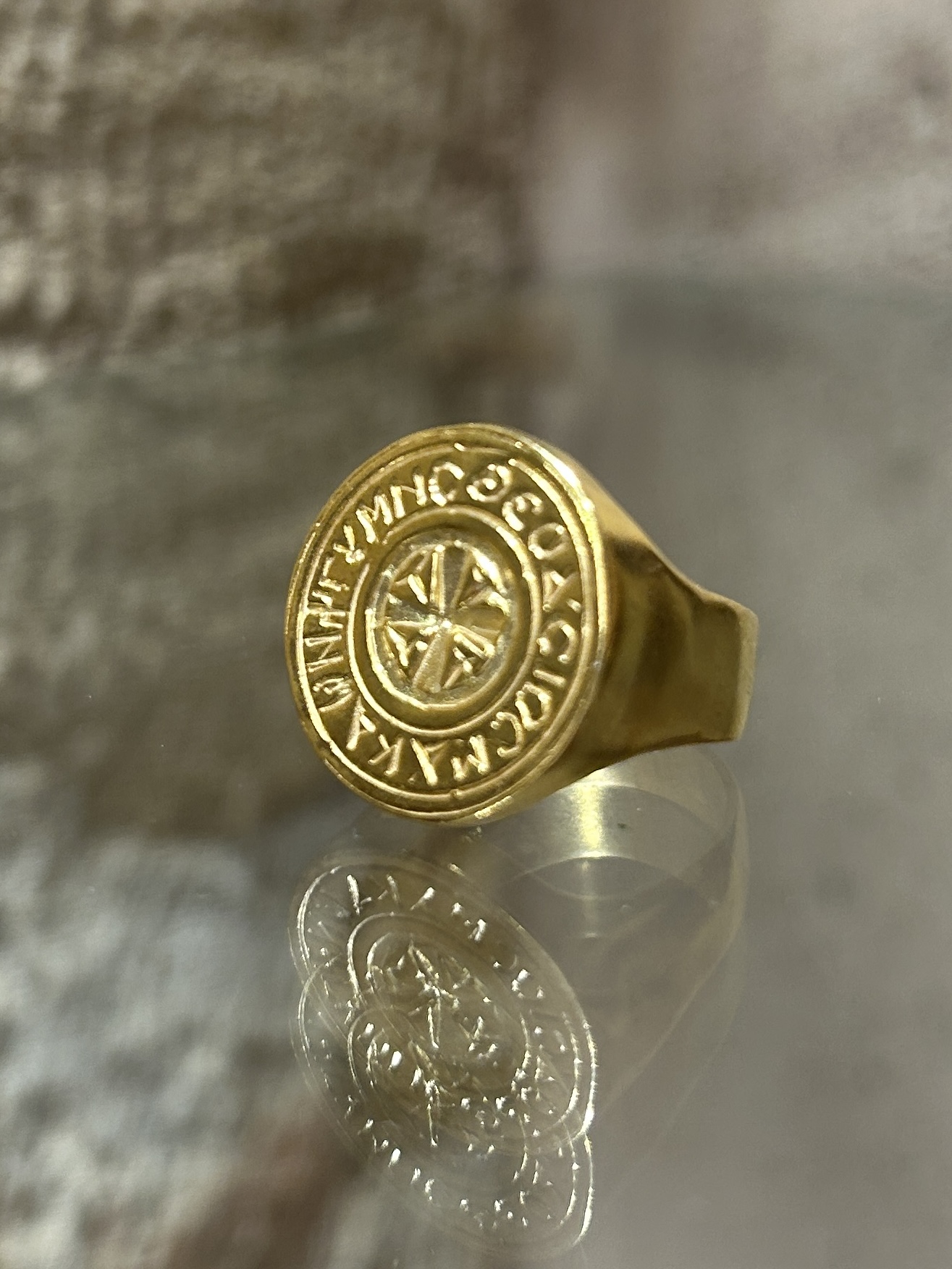 golplated silver signet ring with the inscription Theodosios and the byzantine cross